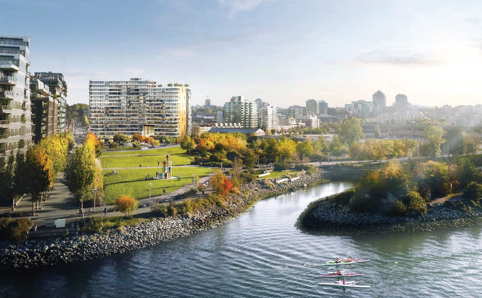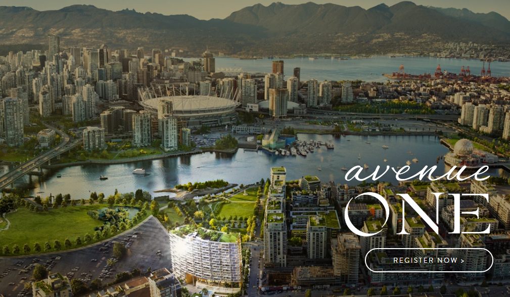 Concord Pacific is coming across to False Creek with Avenue One. Avenue One will be built on the site across West 1st Avenue from Hinge Park in Southeast False Creek. This is the whole, almost triangular, block bounded by West 1st Ave, Manitoba, West 2nd Ave, and Cook St. This unique site to led to a unique design. The curve of the building maximizes outlooks over Hinge Park and the future waterfront park along the seawall to the west. The curve of the building will run from the corner of 2nd and Manitoba to the corner of 1st and Cook, and will thereby minimize the the number of units that face the traffic on West 2nd.